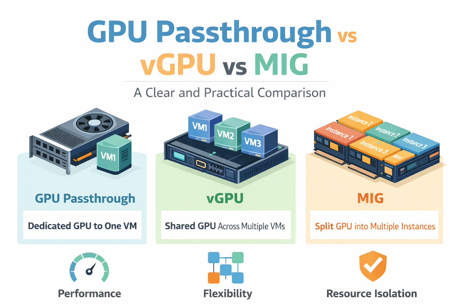 However, terms like GPU Passthrough, vGPU, and MIG can sound confusing, especially for people new to this space. Each approach solves a different problem and comes with its own benefits and trade-offs.