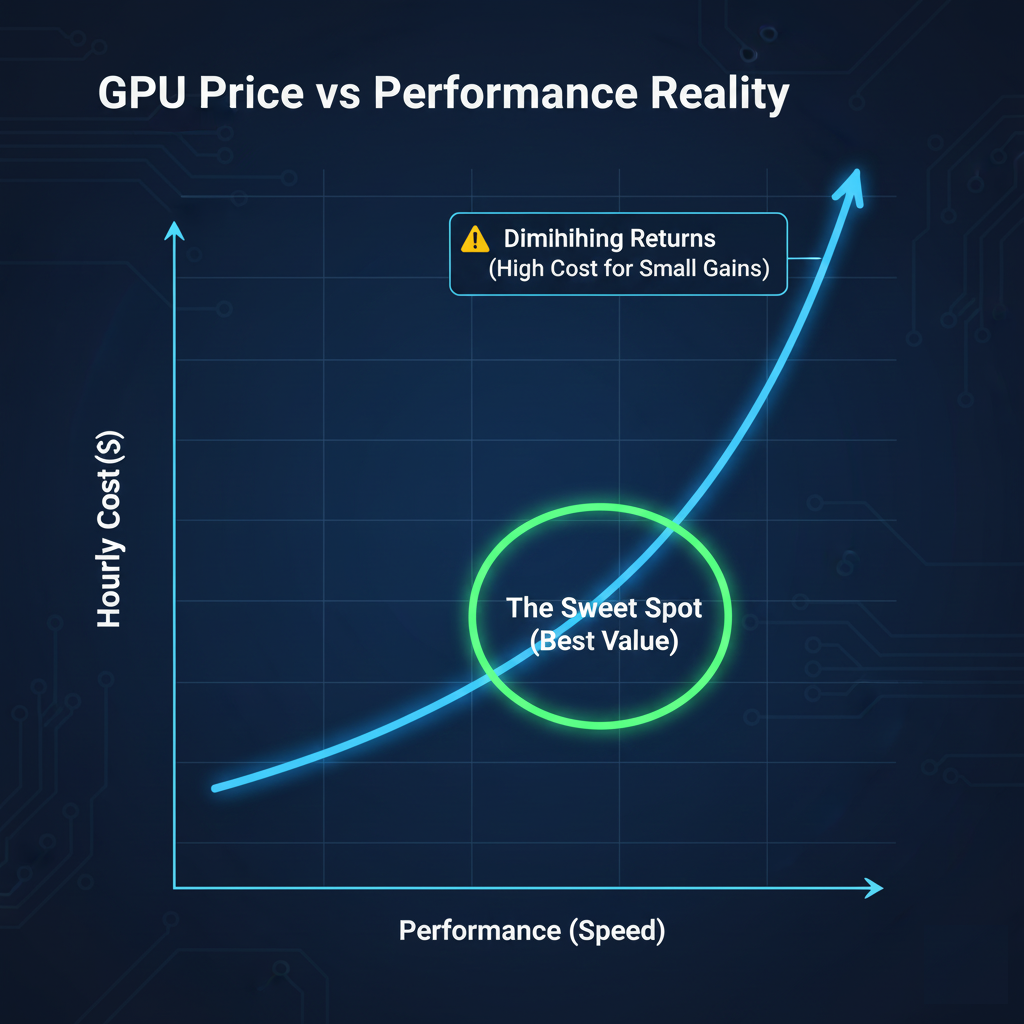 Everyone wants the fastest GPU with the most cores and memory, but nobody wants the bill. The relationship between performance and price in the cloud is rarely a straight line. Often, to get that last 20% boost in speed, you might have to pay 100% more. You need to find the “sweet spot” , the point where you get the most performance before the cost skyrockets.