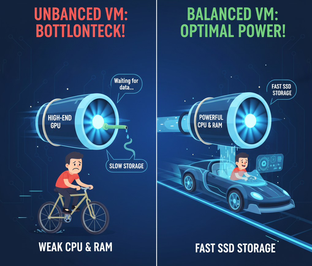 A common mistake is renting an expensive GPU and attaching it to a weak virtual machine. Imagine putting a jet engine on a bicycle frame. The frame can’t handle the power, and you won’t go very fast. The GPU needs to be fed data constantly. If your virtual machine has a slow CPU or insufficient system RAM, the super-fast GPU will just sit idle, waiting for instructions. If you use slow hard drive Storage instead of fast SSDs, the GPU will spend all its time waiting for files to load.