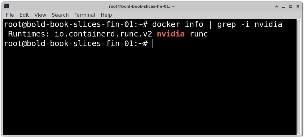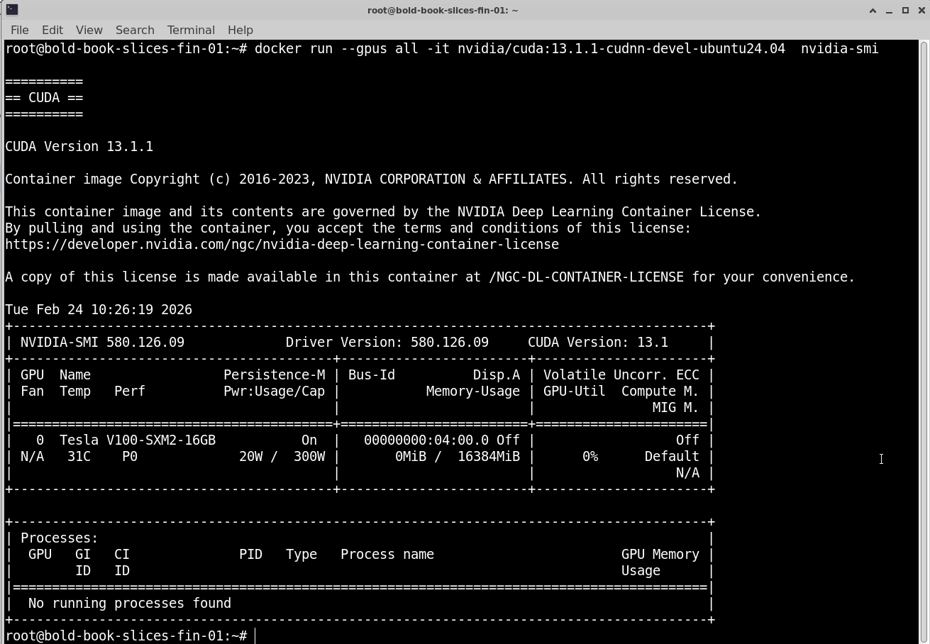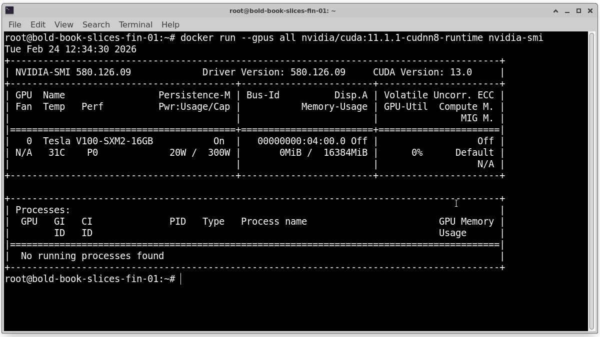 If installed correctly, it will show GPU model, Driver version and GPU memory usage. If this command fails, containers will not detect the GPU.