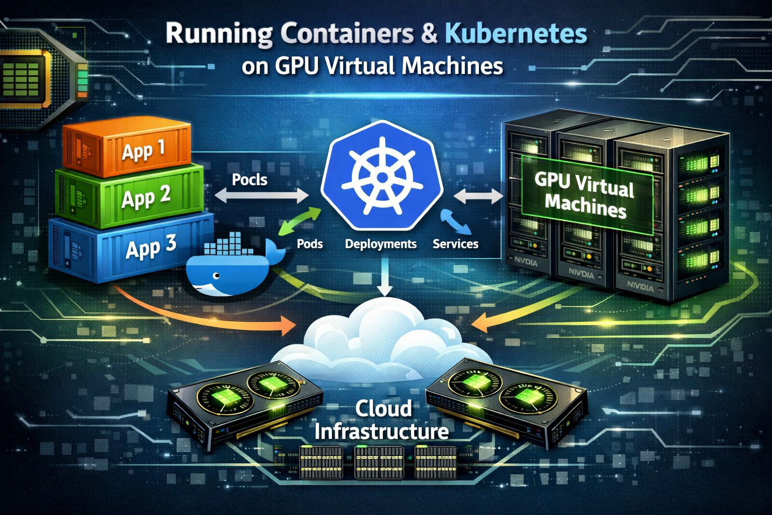 GPU Virtual Machines (VMs) provide the hardware foundation for running GPU workloads in the cloud. In a containerized environment, platforms like Kubernetes schedule containers on these GPU-enabled VMs.