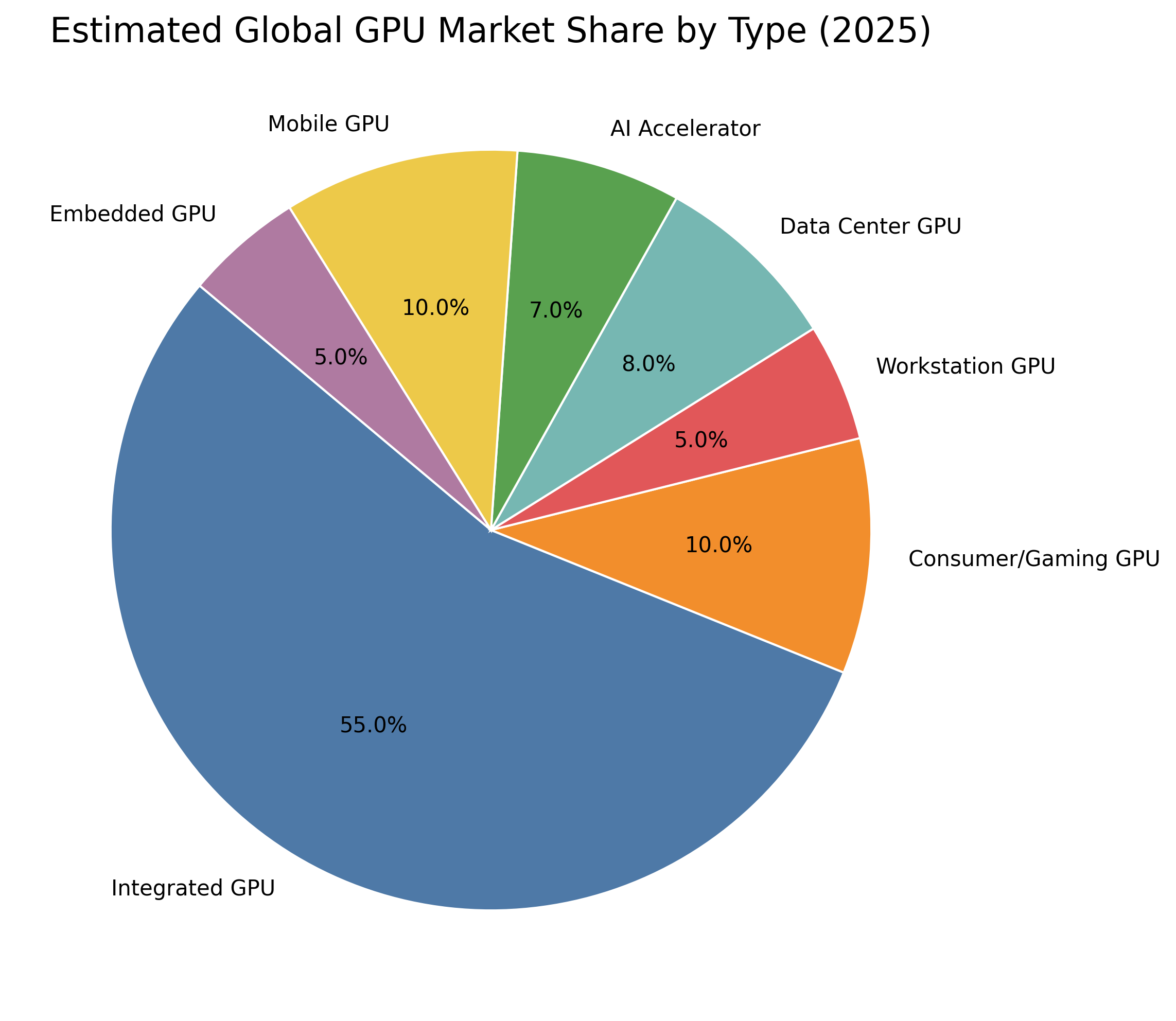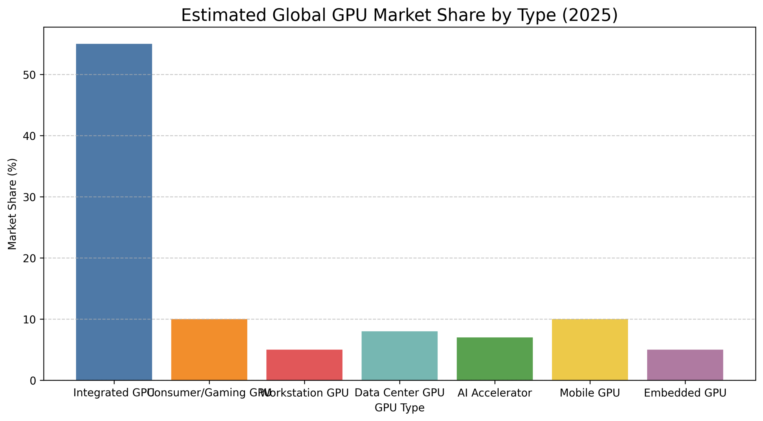 - The 2025 GPU market is dominated by Integrated GPUs, which account for approximately 55% of total units due to their widespread inclusion in laptops, desktops, and mobile devices.