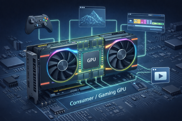 Consumer GPUs are discrete graphics cards designed to deliver high performance for graphics and compute workloads at a relatively affordable price. They include dedicated high-speed memory and powerful parallel processing cores.