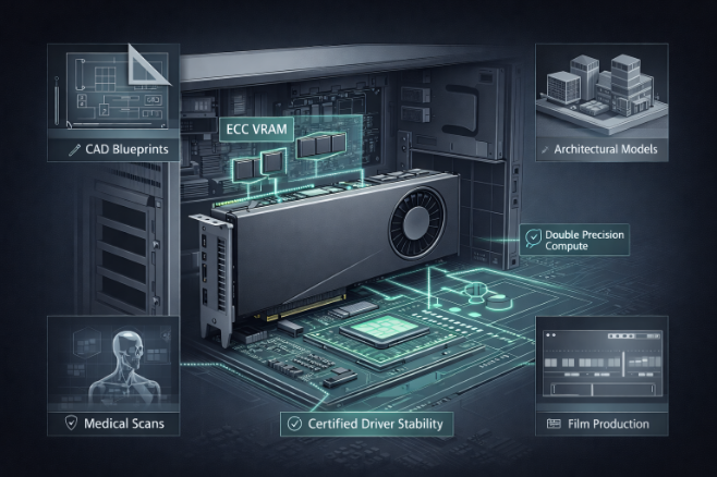 Workstation GPUs are designed for accuracy, stability, and long-duration workloads. They prioritize consistent performance and application compatibility over gaming-centric optimizations.