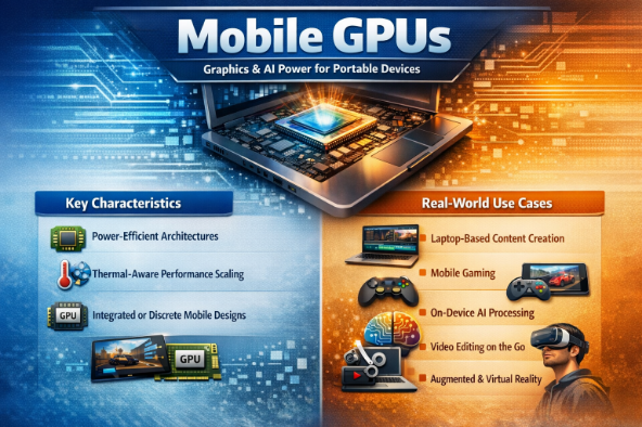 Mobile GPUs are designed for portable devices, balancing performance with strict power and thermal limits. They dynamically scale performance based on available power and cooling capacity.