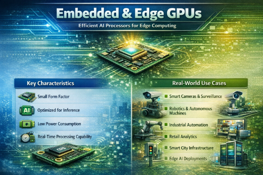 Embedded GPUs are compact, energy-efficient processors designed to operate at the network edge, close to where data is generated. They reduce latency and bandwidth usage by processing data locally rather than in the cloud.